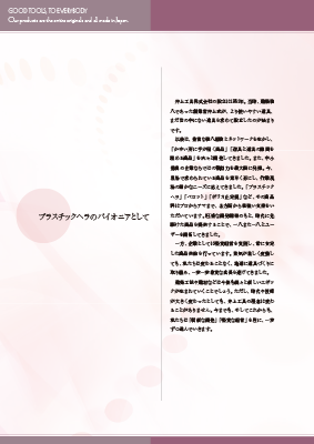 製品カタログと、二つ折りの会社概要パンフレットを同時に制作しました。会社概要のほうは至ってシンプルに、製品写真、社内写真などを掲載せず、本文と会社データ、地図などで構成しています。とくに裏表紙はほとんど真っ白な「紙そのまま」の状態で、ロゴ・社名・住所などで構成しています。